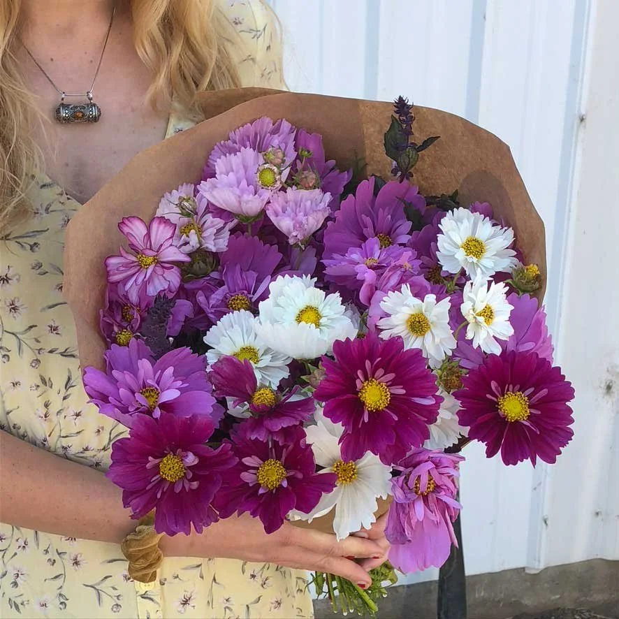 A luscious bouquet of cosmos and Aromatto - a decorative basil, all direct seeded in late May and early June.