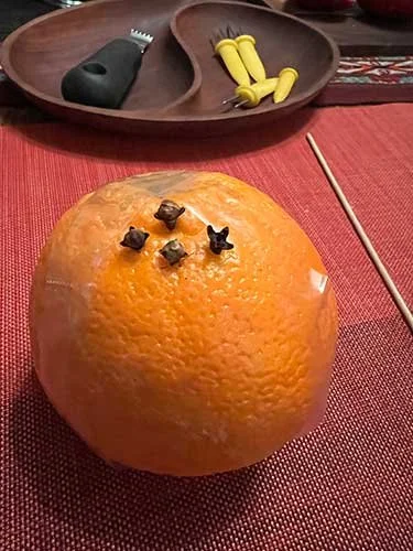 Here you can see a pomander started with a wooden skewer to make holes. The first few cloves are inserted. Holly put out corn cob holders as another way to make holes in a fun pattern